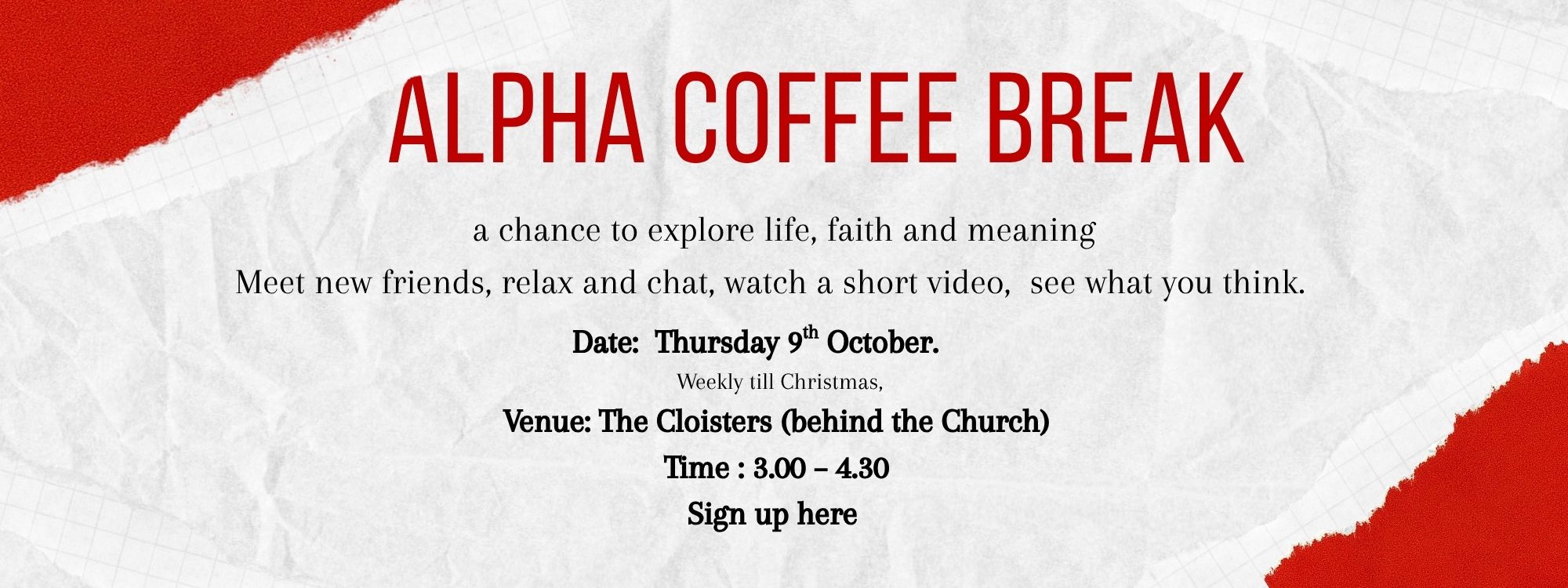 We serve tea, coffee and biscuits after the 10.30am service in the Cloisters.  It is a great way to meet people and to find out more about us. You would be very welcome to join us.